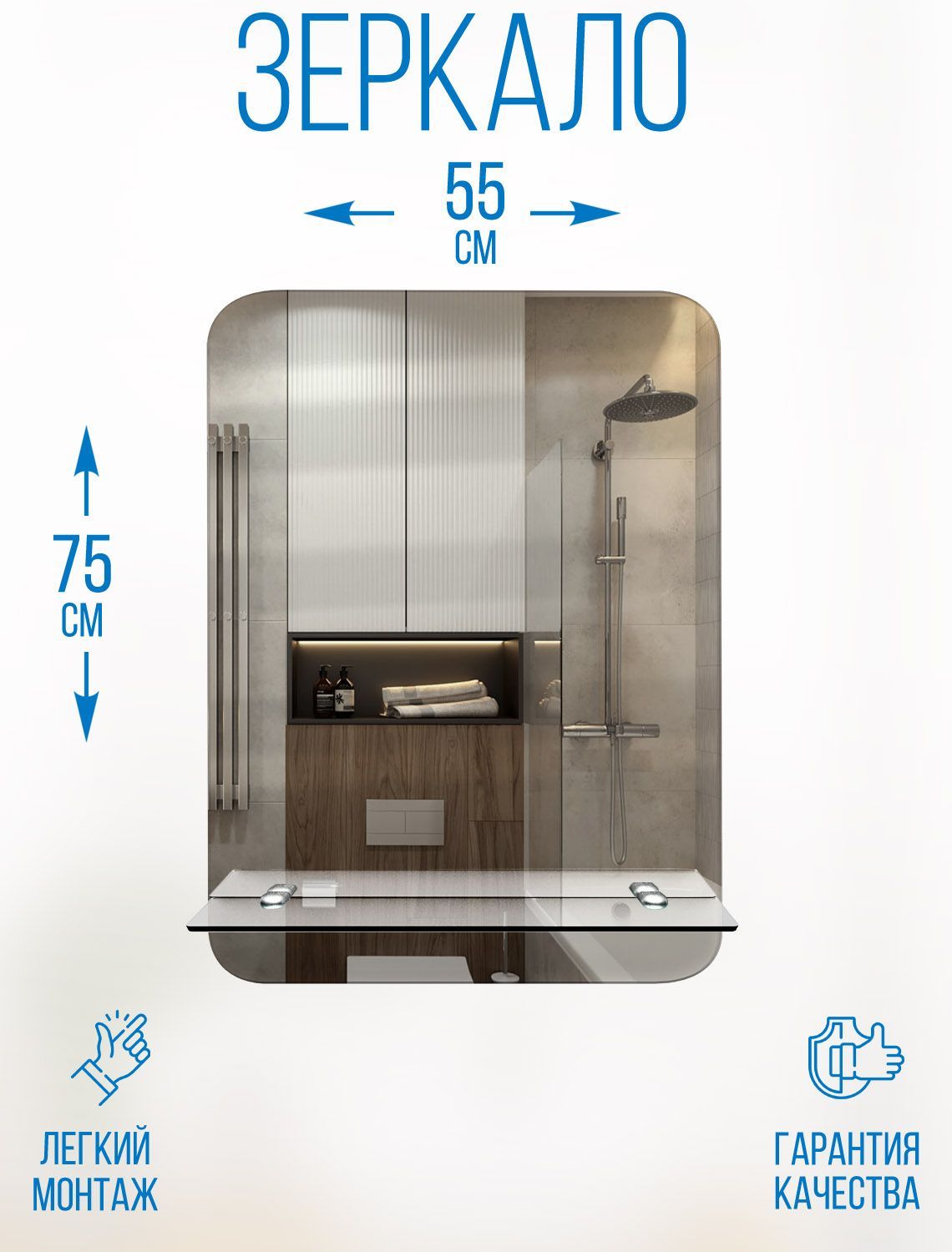 Зеркало интерьерное 75х55 см с полкой 50х11 см. Кронштейны для полки металл. Толщина зеркала 4мм толстое и прочное! Устойчиво к влаге подойдёт для всех типов помещений, крепление в комплекте.