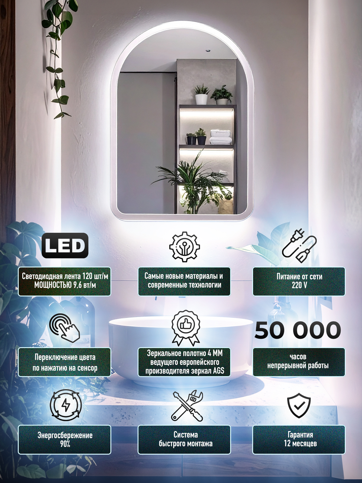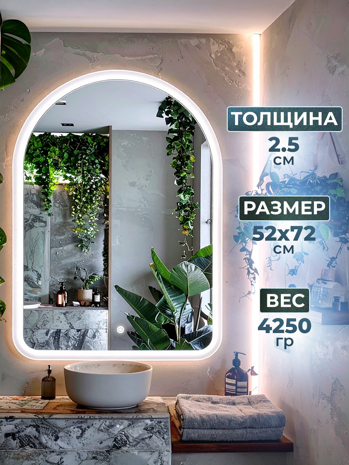 Современный дизайн и качественные материалы гарантируют долговечность и устойчивость к воздействию влаги, что делает зеркало идеальным вариантом для ванной. Подсветка выполнена так, чтобы мягко рассеивать свет, создавая комфортную атмосферу и уменьшая нагрузку на глаза во время использования.